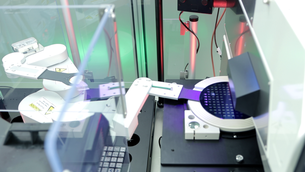 The Promis-A Station is equipped with two loadports, a pre-aligner, a dual-arm robot for fast handling of wafers and an INM200 microscope or something comparable.